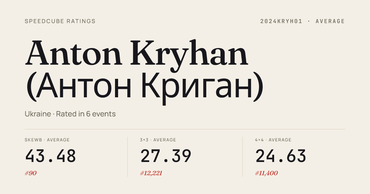 Mar 22, 20263x3x3 Cube · Round 1RuzomberokOpen2026 · 29th14.03Mar 22, 20263x3x3 Cube · Round 2RuzomberokOpen2026 · 28th13.28Mar 22, 20264x4x4 Cube · Round 1RuzomberokOpen2026 · 32nd1:14.55Mar 22, 2026Clock · Round 1RuzomberokOpen2026 · 17th9.66Mar 22, 2026Pyraminx · Round 1RuzomberokOpen2026 · 32nd11.20Mar 22, 2026Skewb · FinalRuzomberokOpen2026 · 2nd3.00Mar 22, 2026Skewb · Round 2RuzomberokOpen2026 · 5th3.22Mar 22, 2026Skewb · Round 1RuzomberokOpen2026 · 2nd3.04Nov 2, 20252x2x2 Cube · Round 1UkrainianNationals2025 · national · 42nd5.91Nov 2, 20252x2x2 Cube · Round 2UkrainianNationals2025 · national · 47th6.88Nov 2, 20253x3x3 Cube · Round 1UkrainianNationals2025 · national · 36th14.60Nov 2, 20253x3x3 Cube · Round 2UkrainianNationals2025 · national · 33rd14.22Nov 2, 20253x3x3 Blindfolded · Round 1UkrainianNationals2025 · national · 6th2:38.30Nov 2, 20254x4x4 Cube · Round 1UkrainianNationals2025 · national · 36th1:16.18Nov 2, 2025Clock · Round 1UkrainianNationals2025 · national · 12th12.06Nov 2, 2025Clock · Combined FinalUkrainianNationals2025 · national · 11th12.08Nov 2, 2025Pyraminx · Round 1UkrainianNationals2025 · national · 49th20.72Nov 2, 2025Skewb · FinalUkrainianNationals2025 · national · 4th3.31Nov 2, 2025Skewb · Round 1UkrainianNationals2025 · national · 3rd3.40