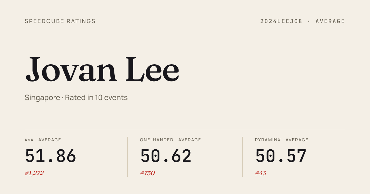Apr 11, 2026Pyraminx · FinalNUSMasters2026 · 1st1.74Mar 22, 20263x3x3 Cube · Round 2SingaporePyraminxMarch2026 · 14th9.59Mar 22, 20263x3x3 Cube · Round 1SingaporePyraminxMarch2026 · 16th10.29Mar 22, 20263x3x3 One-Handed · Round 1SingaporePyraminxMarch2026 · 5th15.46Mar 22, 20263x3x3 One-Handed · Round 2SingaporePyraminxMarch2026 · 6th14.51Mar 22, 20263x3x3 One-Handed · FinalSingaporePyraminxMarch2026 · 4th14.83Mar 22, 20264x4x4 Cube · Round 1SingaporePyraminxMarch2026 · 11th36.08Mar 22, 20264x4x4 Cube · Round 2SingaporePyraminxMarch2026 · 11th37.83Mar 22, 2026Clock · Round 1SingaporePyraminxMarch2026 · 17th4.05Mar 22, 2026Pyraminx · Round 1SingaporePyraminxMarch2026 · 1st1.83Mar 22, 2026Pyraminx · Round 2SingaporePyraminxMarch2026 · 3rd2.64Mar 22, 2026Pyraminx · FinalSingaporePyraminxMarch2026 · 3rd2.33Mar 22, 2026Square-1 · Round 1SingaporePyraminxMarch2026 · 8th17.86Mar 8, 20263x3x3 Cube · Round 1BacktoDowntownSingapore2026 · 22nd11.46Mar 8, 20263x3x3 One-Handed · Round 1BacktoDowntownSingapore2026 · 4th14.92Mar 8, 20263x3x3 One-Handed · Round 2BacktoDowntownSingapore2026 · 5th14.92Mar 8, 20263x3x3 One-Handed · FinalBacktoDowntownSingapore2026 · 5th15.85Mar 8, 20264x4x4 Cube · Round 2BacktoDowntownSingapore2026 · 6th33.17Mar 8, 20264x4x4 Cube · Round 1BacktoDowntownSingapore2026 · 11th38.86