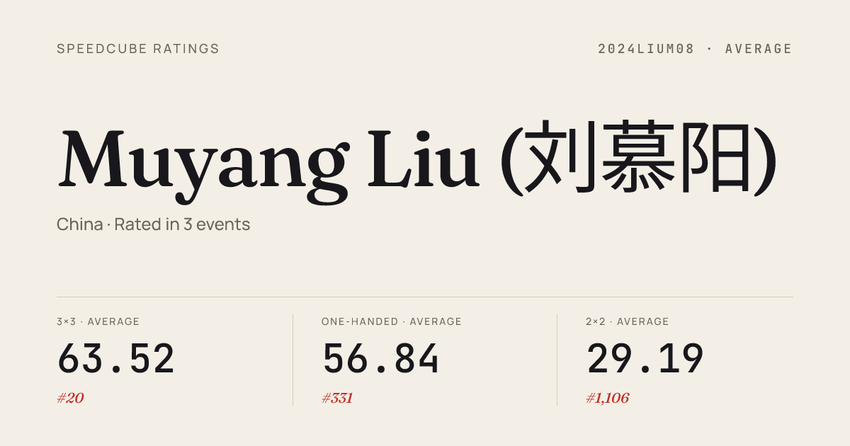 - Mar 29, 20263x3x3 Cube · Semi-FinalYanchengSpringOpen2026 · 11th6.22