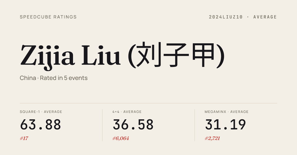 Apr 5, 2026Square-1 · Round 1XianCherryBlossom2026 · 1st7.49Mar 8, 20263x3x3 Cube · Round 1XianjuSpecial2026 · 86th17.00Mar 8, 2026Megaminx · Round 1XianjuSpecial2026 · 19th1:16.21Mar 8, 2026Megaminx · FinalXianjuSpecial2026 · 22nd1:18.04Mar 8, 2026Square-1 · Round 1XianjuSpecial2026 · 2nd7.99Mar 8, 2026Square-1 · FinalXianjuSpecial2026 · 1st6.51Jan 11, 20262x2x2 Cube · Round 1BeijingWinter2026 · 103rd5.96Jan 11, 20263x3x3 Cube · Round 2BeijingWinter2026 · 139th13.99Jan 11, 20263x3x3 Cube · Round 1BeijingWinter2026 · 102nd12.36Jan 11, 20264x4x4 Cube · Round 1BeijingWinter2026 · 66th49.20Jan 11, 2026Square-1 · Round 1BeijingWinter2026 · 1st6.57Jan 11, 2026Square-1 · FinalBeijingWinter2026 · 2nd7.36Jan 1, 20262x2x2 Cube · Round 1CantonCountdown2025 · 25th4.70Jan 1, 20265x5x5 Cube · Combined FinalCantonCountdown2025 · 51st1:35.28Jan 1, 2026Square-1 · Round 1CantonCountdown2025 · 1st6.88Jan 1, 2026Square-1 · FinalCantonCountdown2025 · 1st7.59Dec 28, 20254x4x4 Cube · Round 1ZhengzhouZeal2025 · 88th50.76Dec 28, 2025Square-1 · FinalZhengzhouZeal2025 · 5th8.79Dec 28, 2025Square-1 · Round 1ZhengzhouZeal2025 · 1st7.14