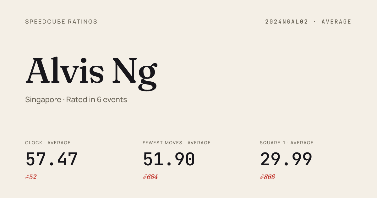 - Feb 22, 20263x3x3 Fewest Moves · FinalSingaporeChampionship2026 · national · 7th37.33