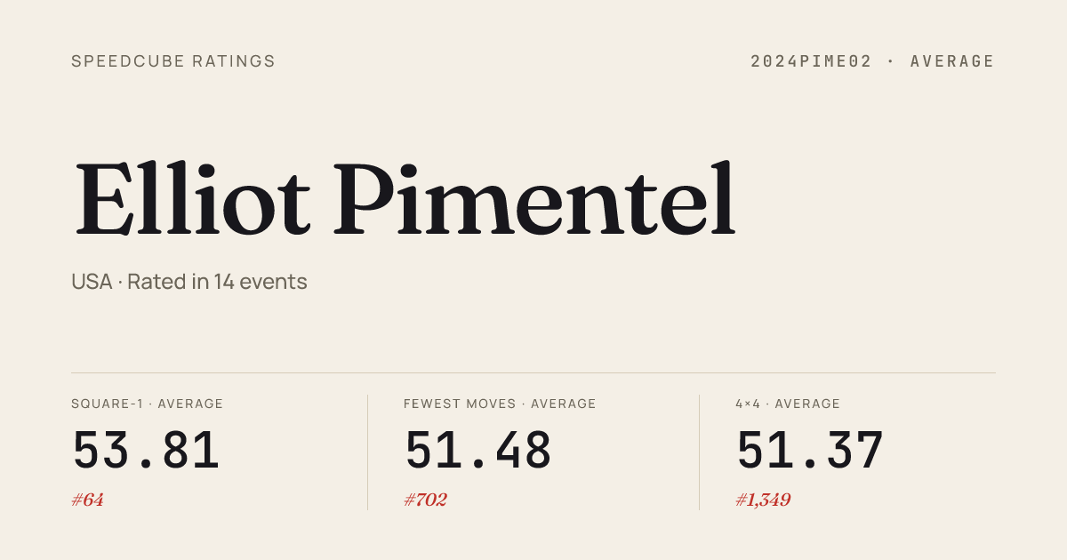Apr 11, 2026Skewb · FinalUtahPuzzlingAwarenessV2026 · 1st4.50Apr 11, 2026Square-1 · Combined FinalUtahPuzzlingAwarenessV2026 · 1st8.05Mar 21, 20262x2x2 Cube · FinalUtahAllStars2026 · 11th4.48Mar 21, 20262x2x2 Cube · Round 1UtahAllStars2026 · 2nd2.17Mar 21, 20263x3x3 Cube · Round 1UtahAllStars2026 · 7th9.74Mar 21, 20263x3x3 Cube · FinalUtahAllStars2026 · 6th9.22Mar 21, 2026Pyraminx · FinalUtahAllStars2026 · 10th5.93Mar 21, 2026Pyraminx · Round 1UtahAllStars2026 · 3rd4.15Mar 21, 2026Square-1 · Combined FinalUtahAllStars2026 · 1st8.14Mar 14, 20263x3x3 Blindfolded · FinalPBQtah92026 · 1st1:07.43Mar 14, 20263x3x3 Blindfolded · Round 1PBQtah92026 · 2nd50.74Mar 14, 20263x3x3 Fewest Moves · FinalPBQtah92026 · 2nd36.67Feb 21, 20263x3x3 Cube · Round 1CubingwithDinosaursLehi2026 · 4th9.05Feb 21, 20263x3x3 Cube · FinalCubingwithDinosaursLehi2026 · 5th9.36Feb 21, 20266x6x6 Cube · Combined FinalCubingwithDinosaursLehi2026 · 4th2:07.38Feb 21, 20267x7x7 Cube · Combined FinalCubingwithDinosaursLehi2026 · 5th3:16.26Feb 21, 2026Megaminx · Round 1CubingwithDinosaursLehi2026 · 3rd57.77Feb 21, 2026Megaminx · Round 2CubingwithDinosaursLehi2026 · 3rd57.38Feb 21, 2026Megaminx · FinalCubingwithDinosaursLehi2026 · 3rd59.83Feb 21, 2026Skewb · FinalCubingwithDinosaursLehi2026 · 2nd4.50