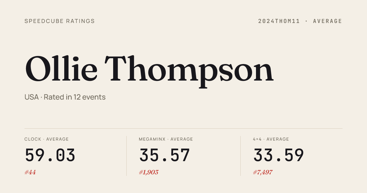 Dec 7, 20253x3x3 One-Handed · Round 1TexasChampionship2025 · 58th31.77Dec 7, 20254x4x4 Cube · Round 1TexasChampionship2025 · 49th53.37Dec 7, 20254x4x4 Cube · Round 2TexasChampionship2025 · 55th57.09Dec 7, 20255x5x5 Cube · Round 1TexasChampionship2025 · 42nd1:45.52Dec 7, 2025Clock · Round 1TexasChampionship2025 · 1st3.58Dec 7, 2025Clock · FinalTexasChampionship2025 · 2nd4.71Dec 7, 2025Megaminx · Round 1TexasChampionship2025 · 15th1:08.43Dec 7, 2025Pyraminx · Round 1TexasChampionship2025 · 12th5.33Dec 7, 2025Pyraminx · Round 2TexasChampionship2025 · 22nd6.35Dec 7, 2025Skewb · Round 2TexasChampionship2025 · 20th5.72Dec 7, 2025Skewb · Round 1TexasChampionship2025 · 18th5.71Dec 7, 2025Square-1 · Round 1TexasChampionship2025 · 43rd36.78Oct 19, 20253x3x3 Cube · Round 1SpaceCityFallTX2025 · 32nd12.56Oct 19, 20253x3x3 Cube · Round 2SpaceCityFallTX2025 · 43rd12.92Oct 19, 20257x7x7 Cube · Combined FinalSpaceCityFallTX2025 · 16th6:10.79Oct 19, 2025Clock · Round 1SpaceCityFallTX2025 · 1st3.04Oct 19, 2025Clock · FinalSpaceCityFallTX2025 · 16th3.13Oct 19, 2025Pyraminx · FinalSpaceCityFallTX2025 · 8th4.63Oct 19, 2025Pyraminx · Round 1SpaceCityFallTX2025 · 6th4.67