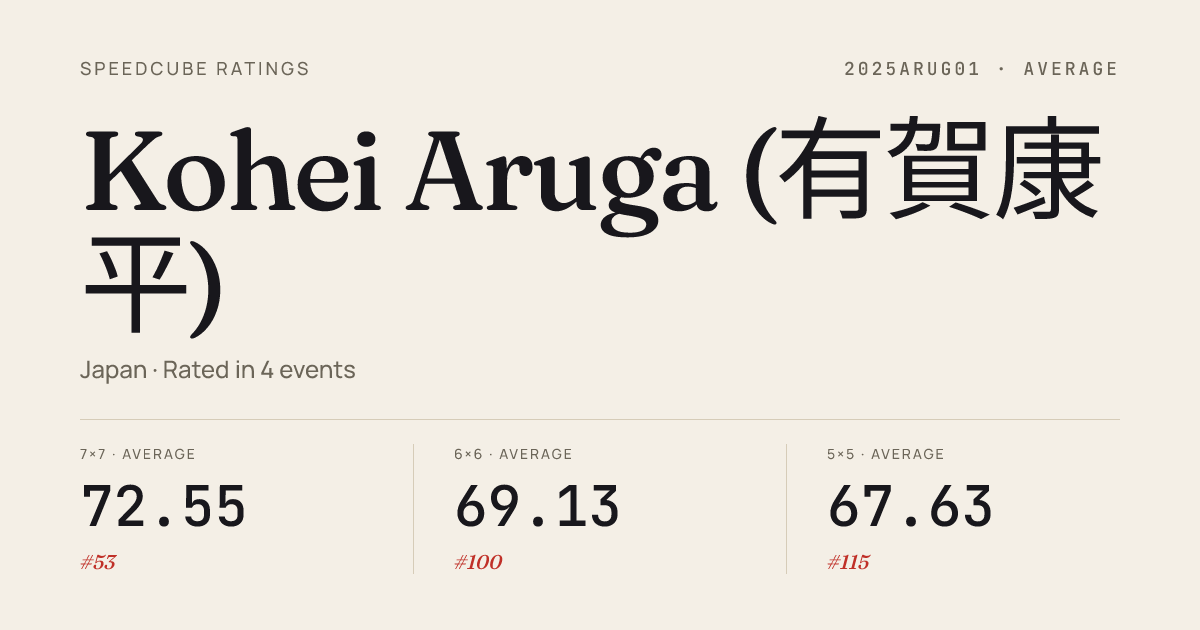 Dec 14, 20257x7x7 Cube · FinalTokaiBigCubes2025 · 2nd2:12.48Dec 14, 20257x7x7 Cube · Round 1TokaiBigCubes2025 · 2nd2:13.03Sep 23, 20256x6x6 Cube · FinalTokyoAutumn2025 · 5th1:32.03Sep 23, 20256x6x6 Cube · Round 1TokyoAutumn2025 · 4th1:30.91Sep 23, 20257x7x7 Cube · Round 1TokyoAutumn2025 · 2nd2:08.46Sep 23, 20257x7x7 Cube · FinalTokyoAutumn2025 · 5th2:25.32Jun 15, 20253x3x3 Cube · Round 1KansaiOddandBLD2025 · 22nd9.20Jun 15, 20253x3x3 Cube · Round 2KansaiOddandBLD2025 · 20th9.26Jun 15, 20255x5x5 Cube · Round 1KansaiOddandBLD2025 · 6th52.43Jun 15, 20255x5x5 Cube · FinalKansaiOddandBLD2025 · 7th53.81Jun 15, 20257x7x7 Cube · Combined FinalKansaiOddandBLD2025 · 2nd2:15.63Apr 12, 20253x3x3 Cube · Round 1TokaiSpring2025 · 6th8.27Apr 12, 20253x3x3 Cube · FinalTokaiSpring2025 · 8th8.74Apr 12, 20257x7x7 Cube · Round 1TokaiSpring2025 · 4th2:19.49Apr 12, 20257x7x7 Cube · FinalTokaiSpring2025 · 4th2:22.07