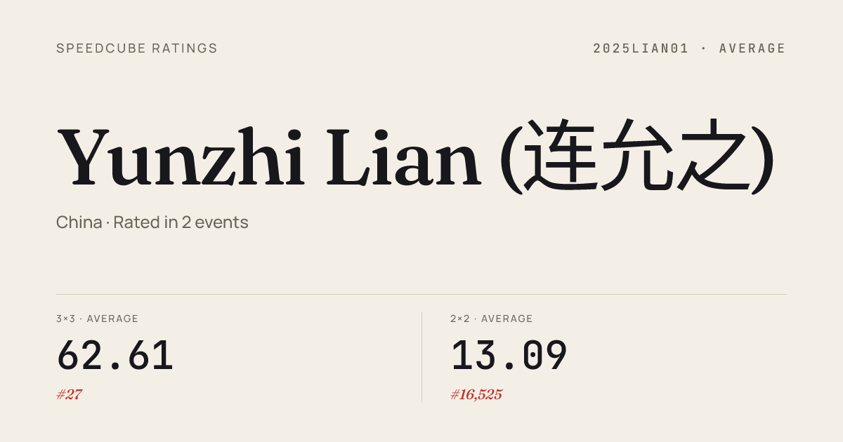 - Apr 12, 20263x3x3 Cube · Semi-FinalXuzhouZenith2026 · 6th5.42