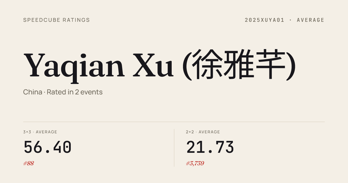 - Apr 12, 20263x3x3 Cube · Semi-FinalXuzhouZenith2026 · 9th6.28